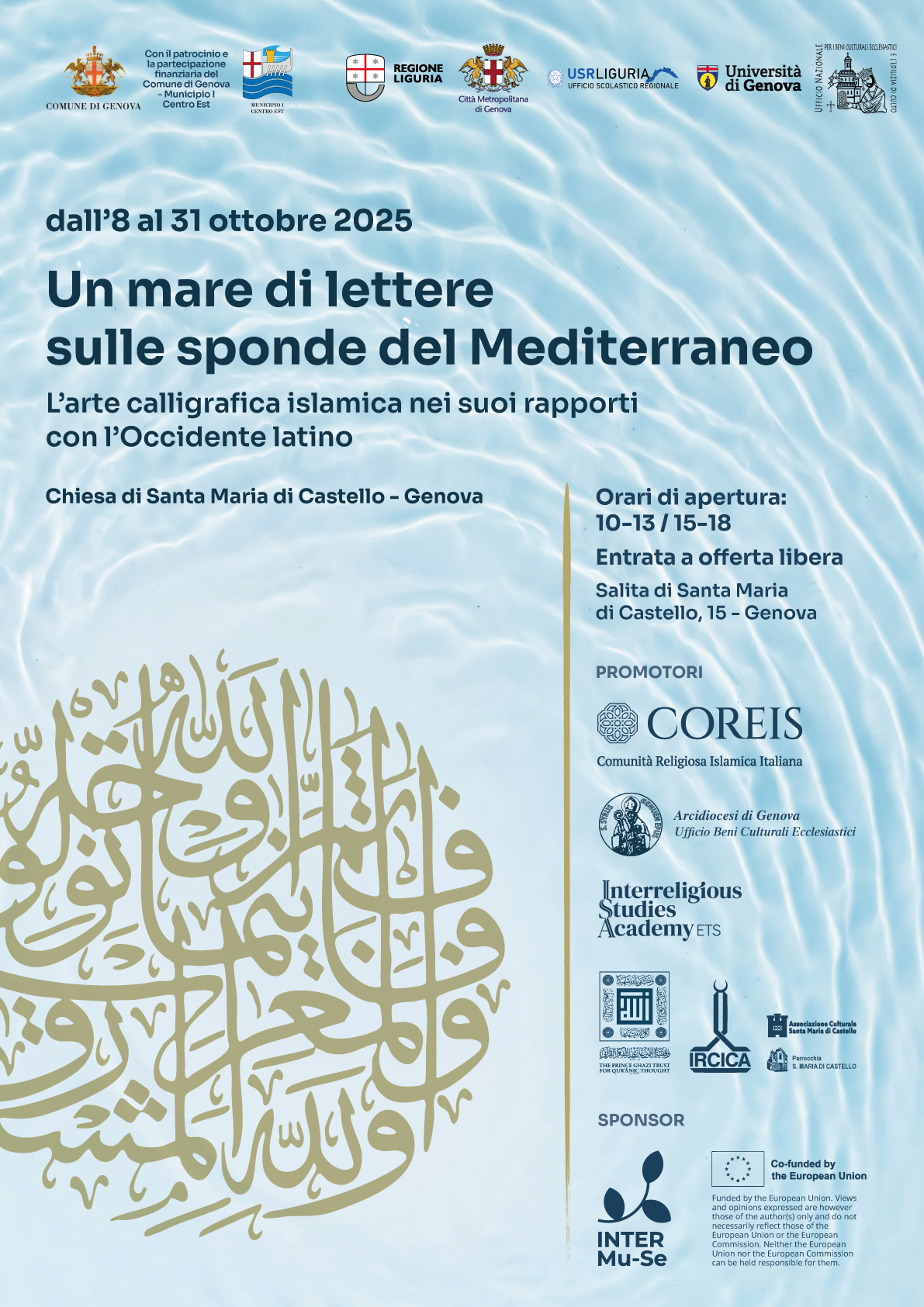 Dall’8 al 31 ottobre 2025 alla Chiesa di Santa Maria di Castello (Genova), una mostra mette in dialogo calligrafia islamica e codici cristiani medievali, affiancando opere contemporanee e collezioni storiche. Il percorso richiama un dialogo antico già testimoniato dal luogo stesso, dove rimangono tracce epigrafiche di quell’incontro. La scrittura emerge come linguaggio universale di bellezza, conoscenza e fede tra le sponde del Mediterraneo. In programma incontri, visite guidate e laboratori di calligrafia aperti al pubblico.